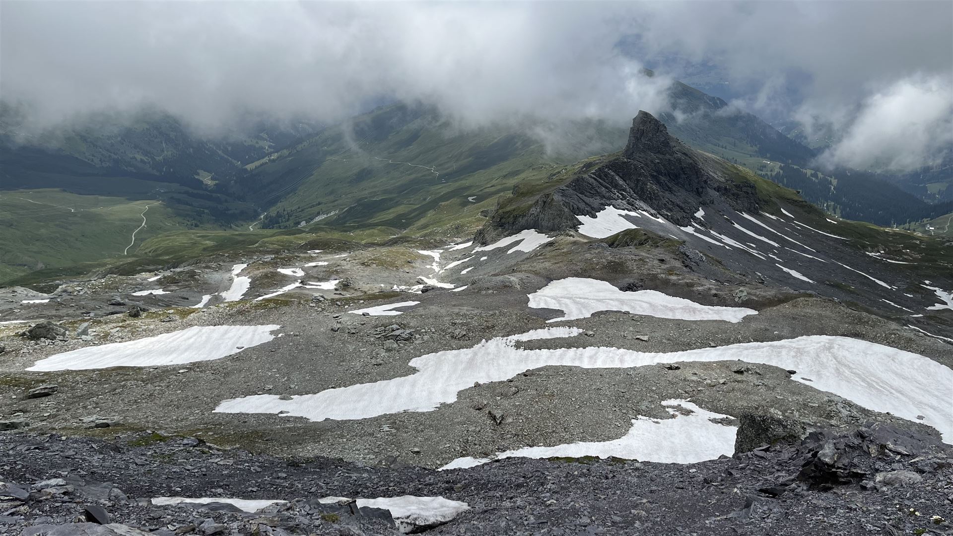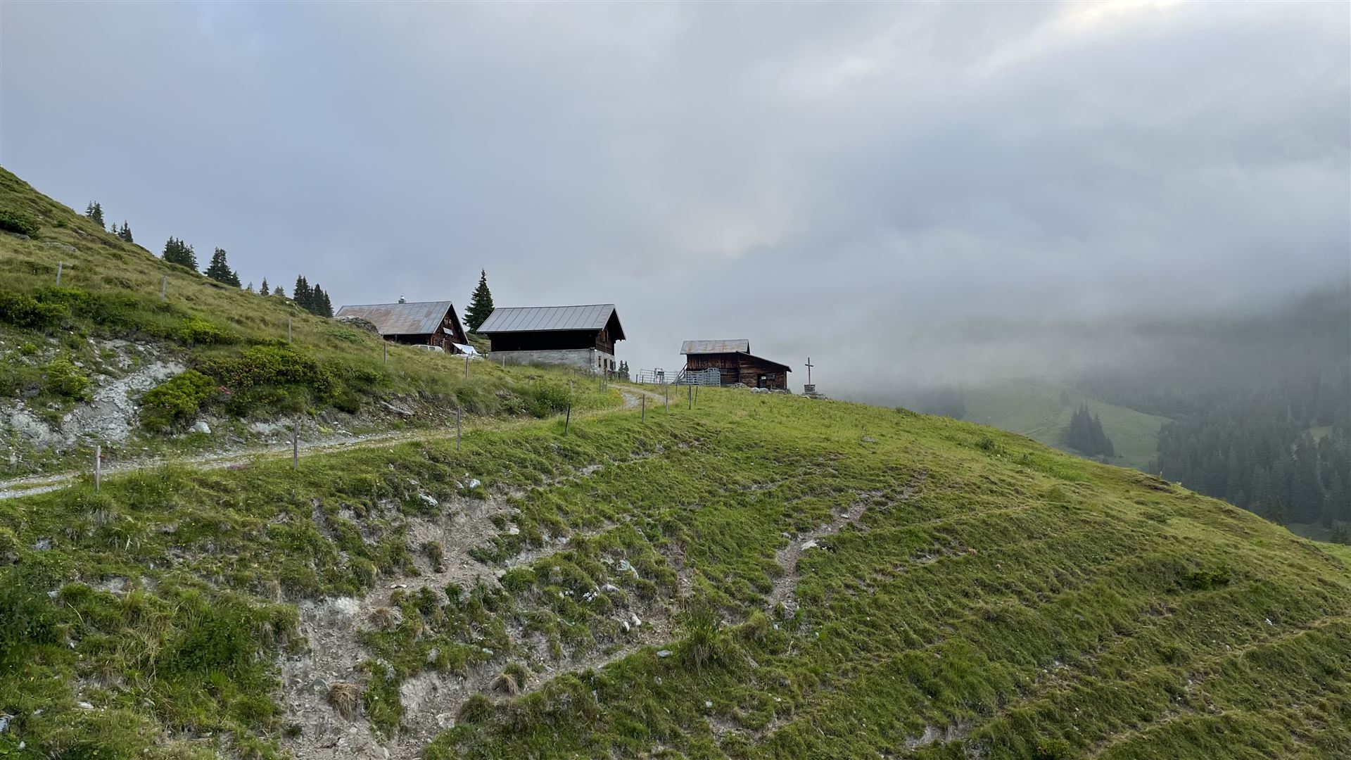 Blick zurück beim Abstieg, Bündner Vorab ist und bleibt in den Wolken