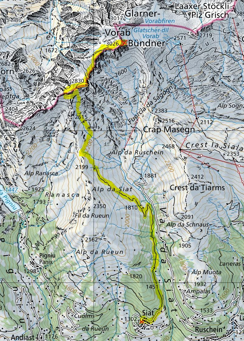 Siat (1320m) - Tegia Sut (1810m) - Tegia Sura (2063m) - Fuorcla da Ranasca (2231m) - Crena Martin (2726m) - Bündner Vorab (3026m) - Crena Martin (2726m) - Fuorcla da Ranasca (2231m) - Tegia Sura (2063m) - Tegia Sut (1810m) - Siat (1320m)