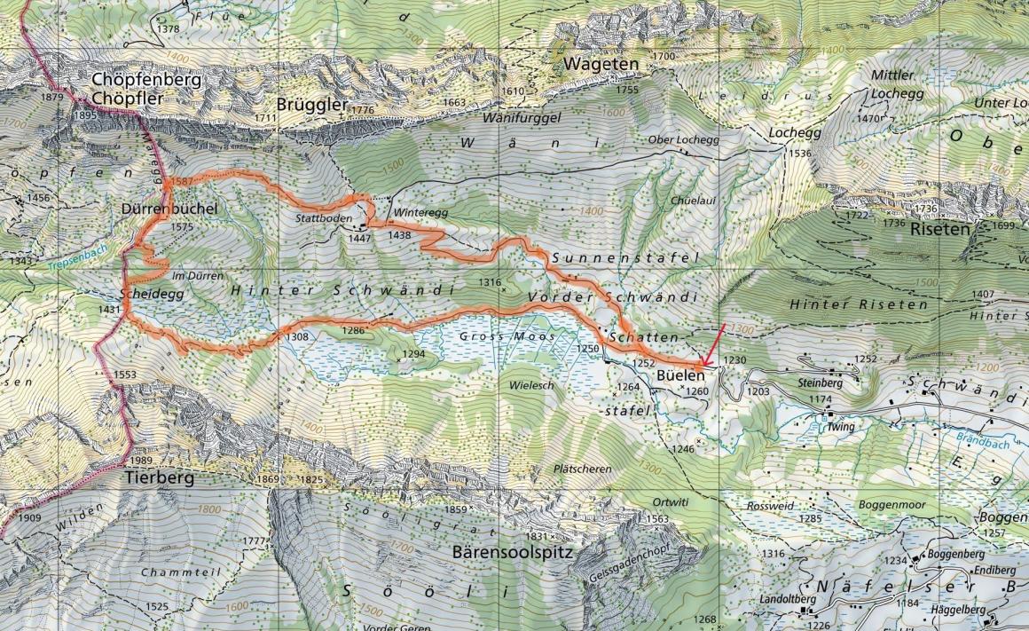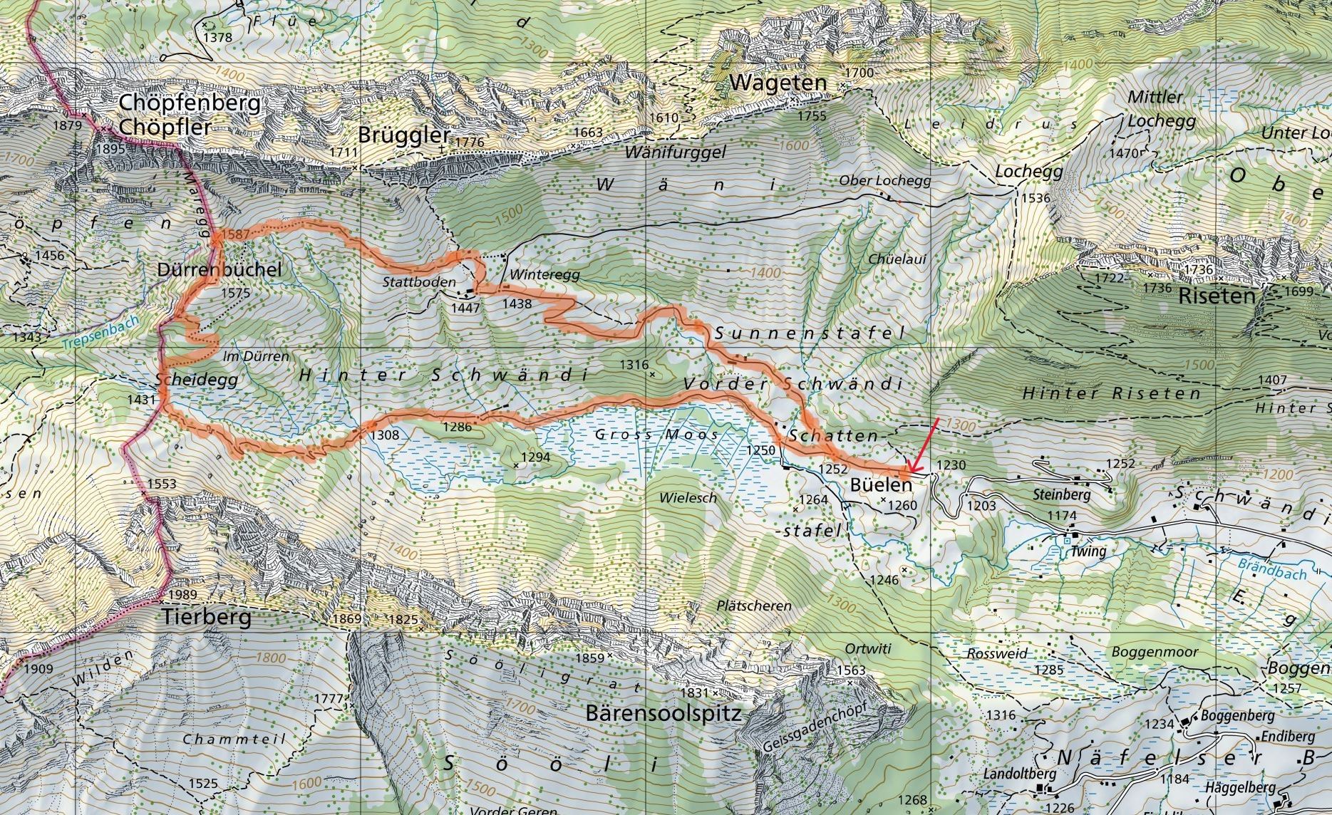 Sehr schöne Rundtour im Schwändital zwischen den Felswänden von Bärensoolspitz, Tierberg, Chöpfler, Brüggler und Wageten.