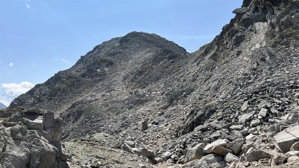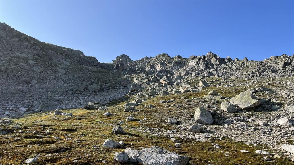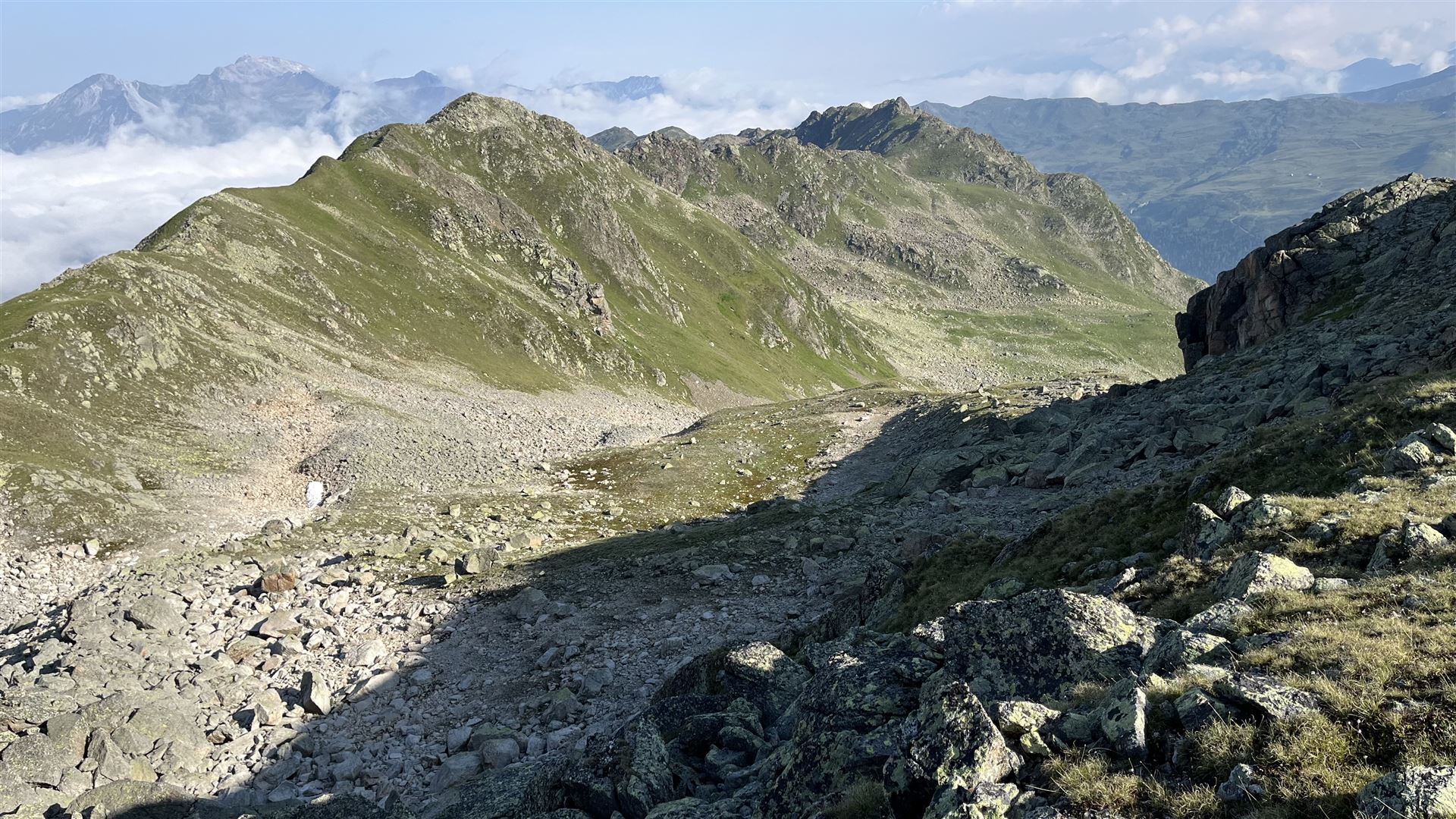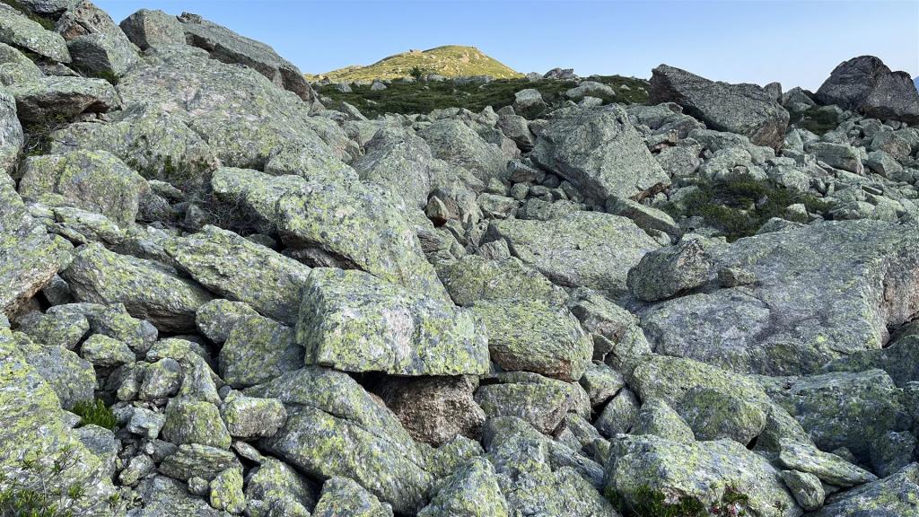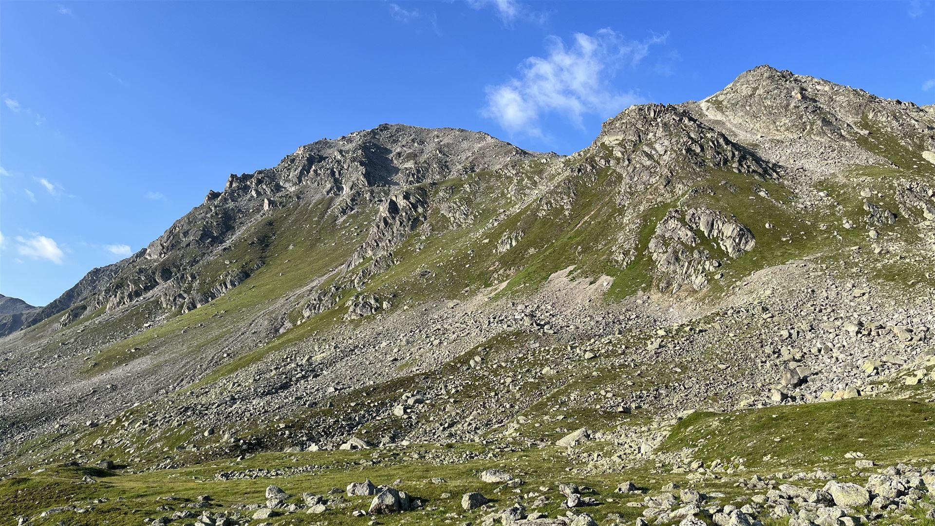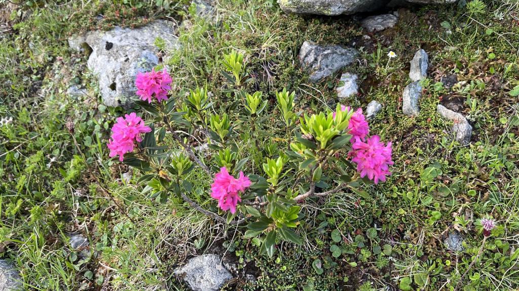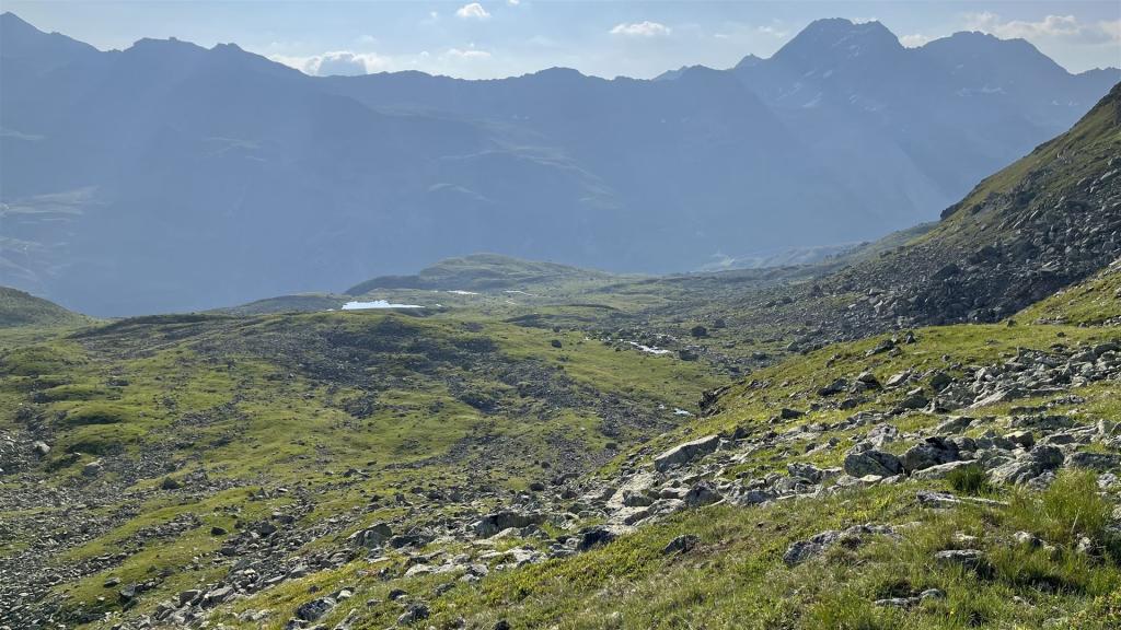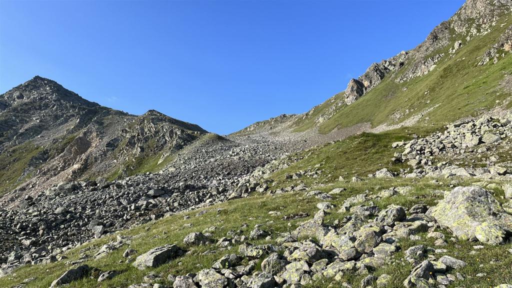 Es gab viel Gras und viel Gestein auf der Tour. Angenehmes Gras eher tiefer mit zusätzlichen Heidelbeeren und Alpenrosen Sträuchern. Blockfelder gab es überall. Geröllhänge gab es höher bis zum Gipfel.
