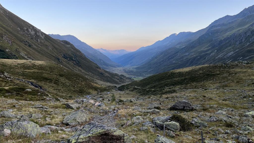 Morgenstimmung nach dem Start mit Blick zurück ins Dischma-Tal