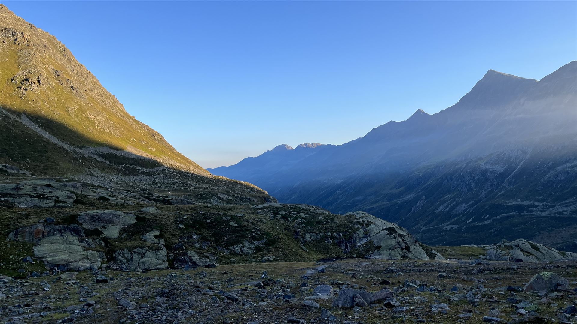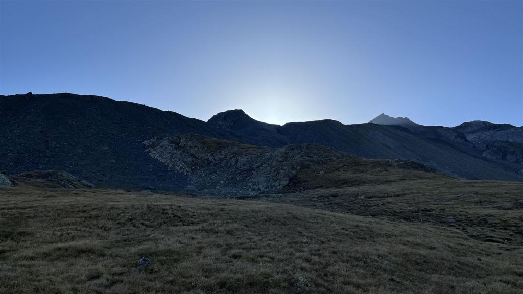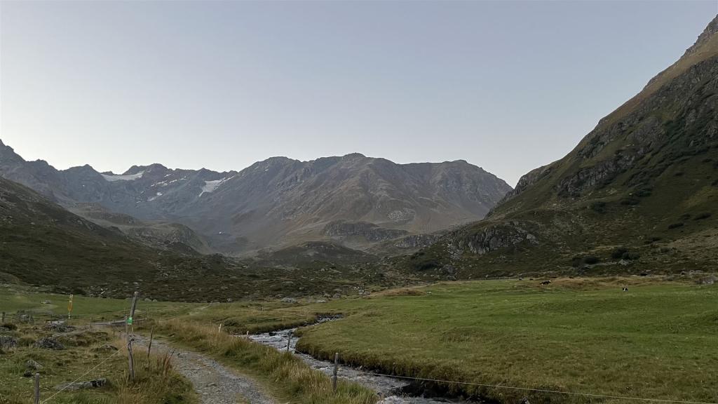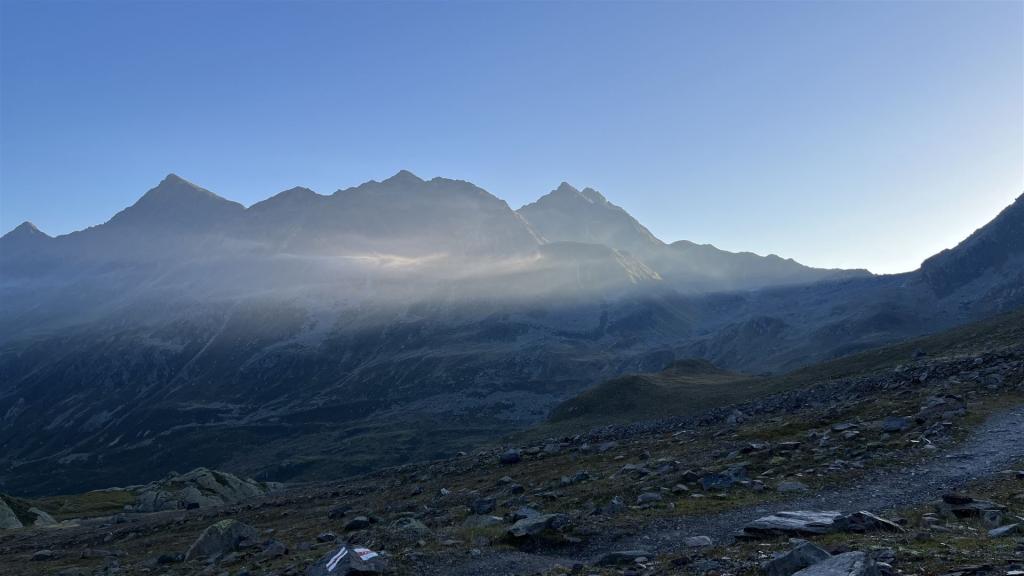 Start am frühen Morgen mit Blick auf Scallettahorn (Mitte)