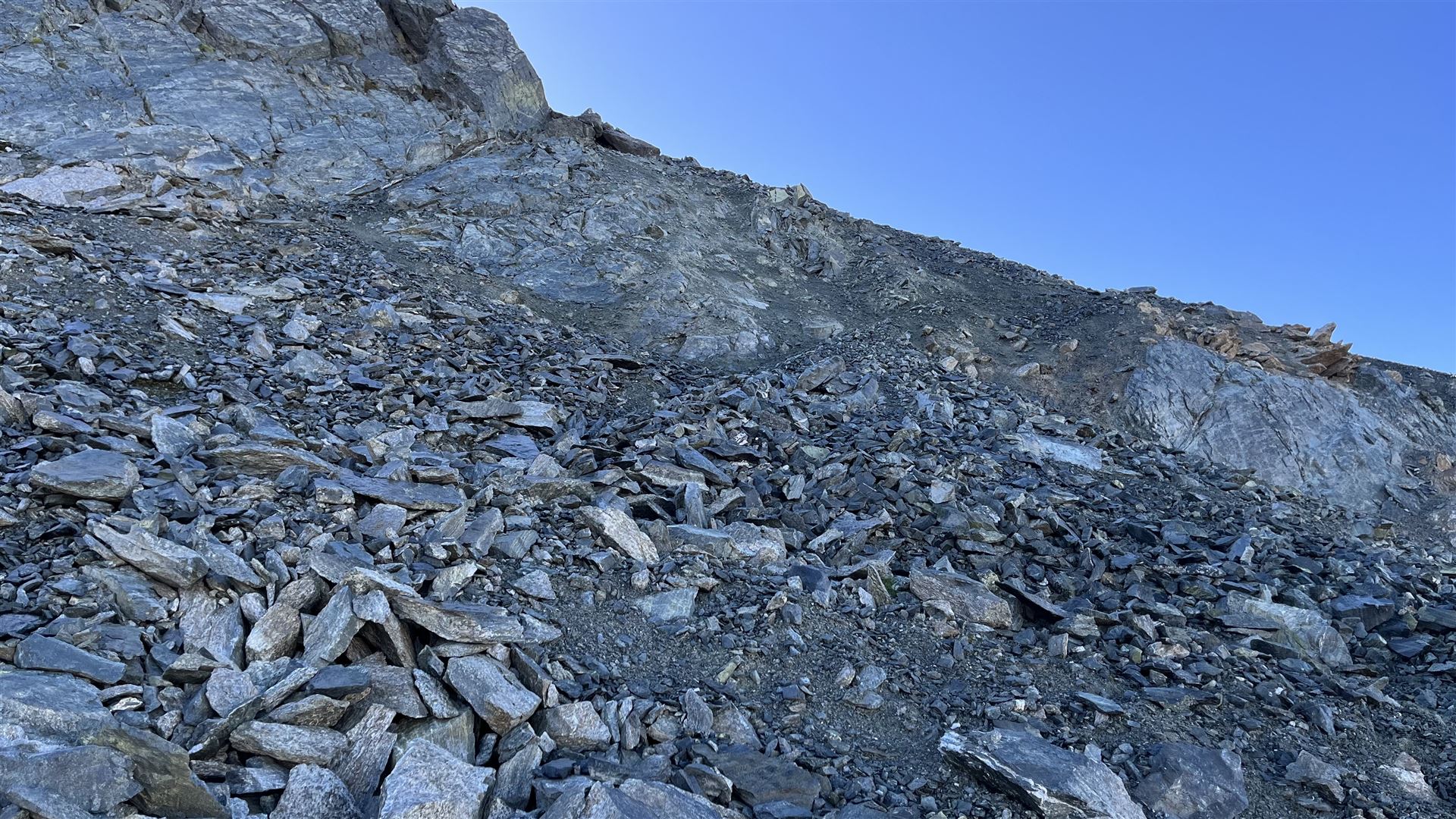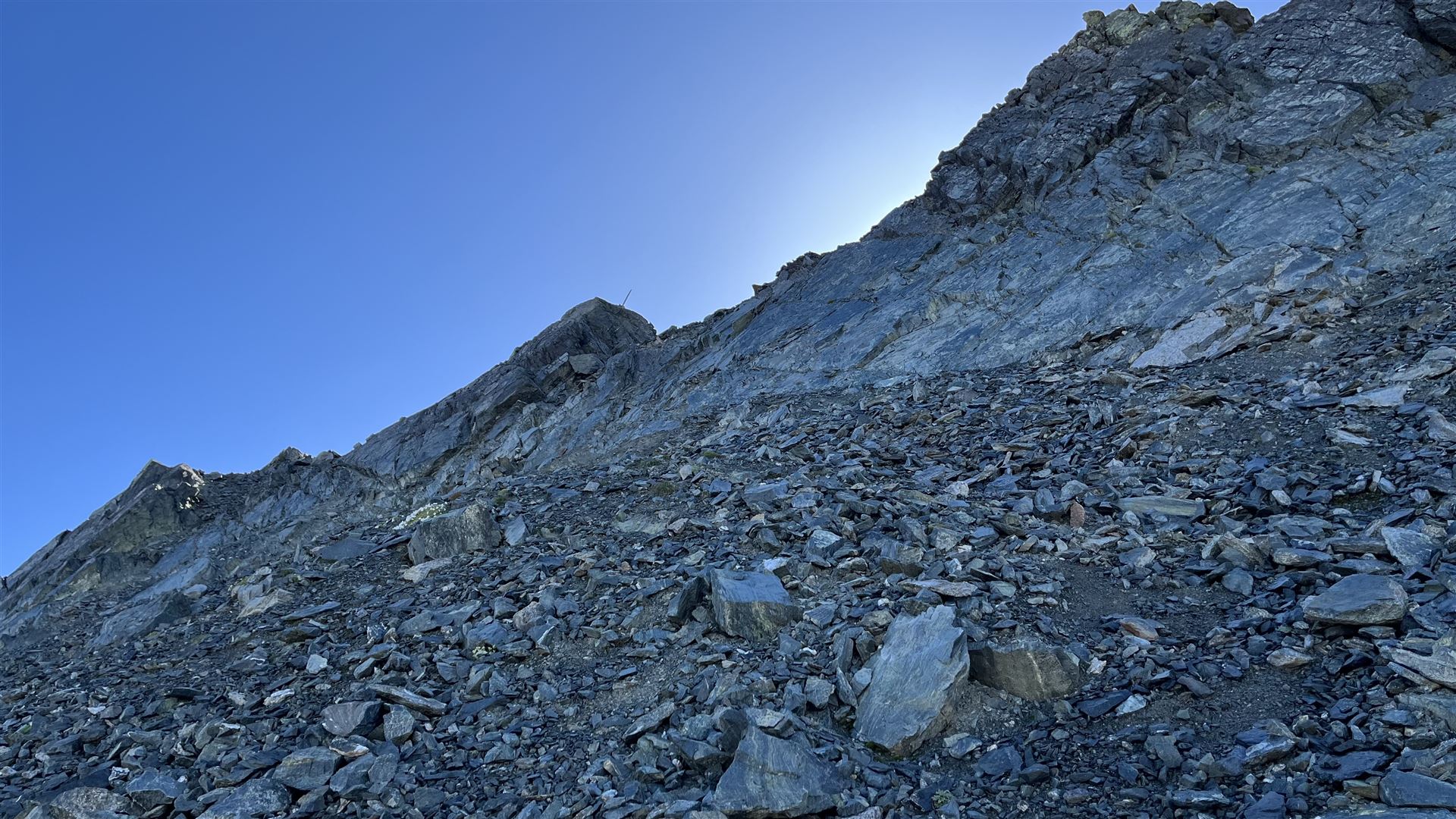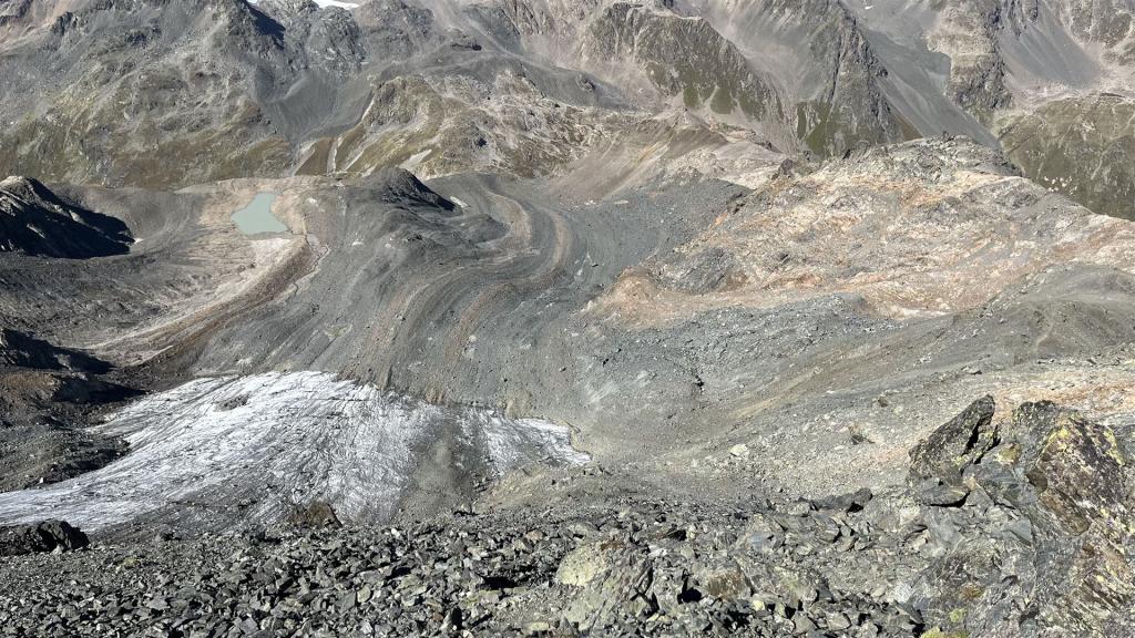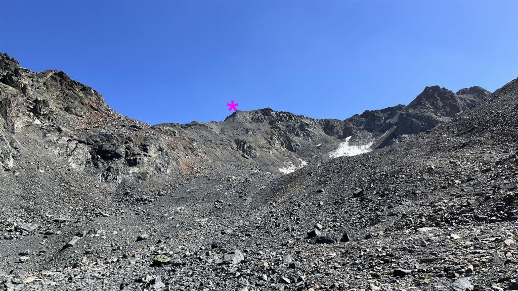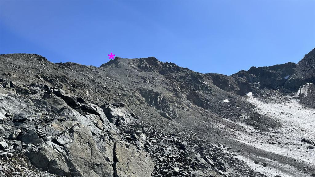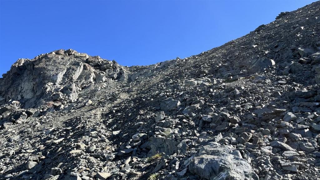 Vom Scalettapass auf das Scalettahorn geht aus dann weglos zuerst ein kleines Stück auf Gras, dann auf Geröll, Geröll und Geröll. Den kleinen Gletscher konnte ich nicht zum Aufstieg benützen, da er zu hart gefroren und für meine Schuhe zu rutschig war.