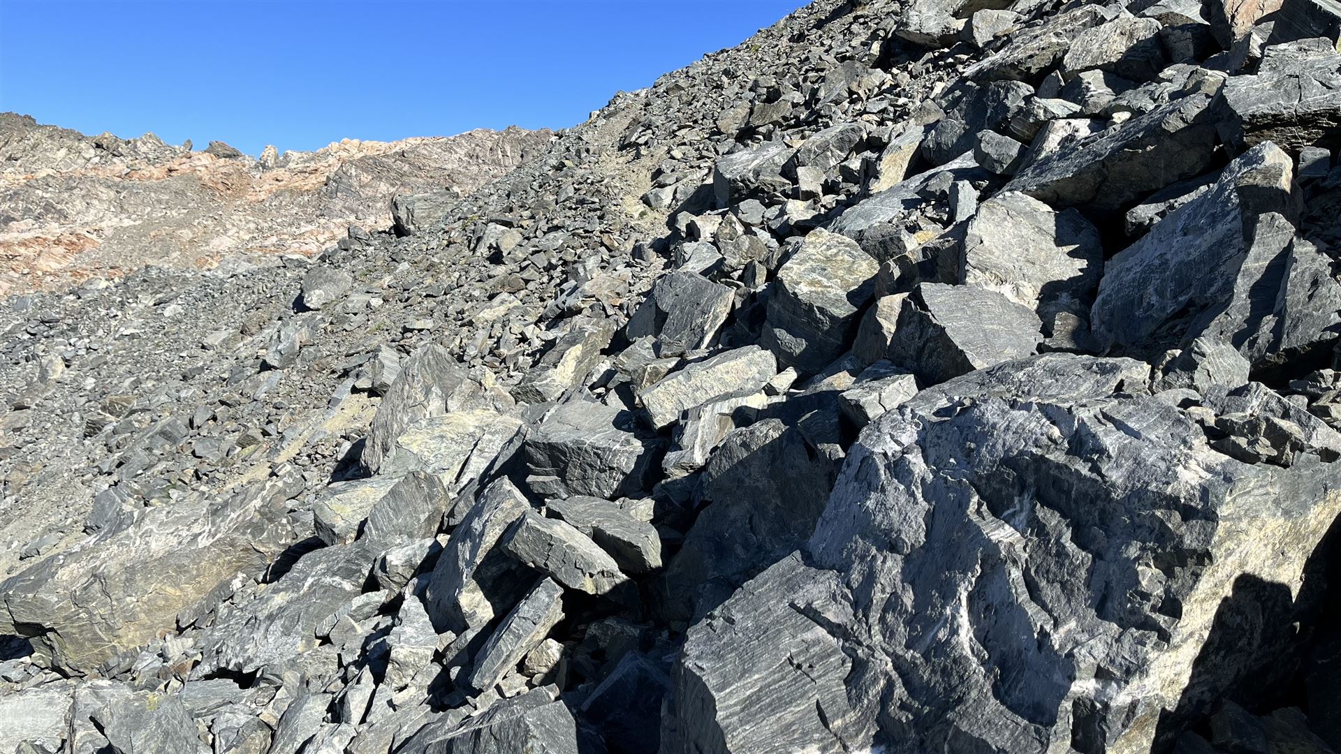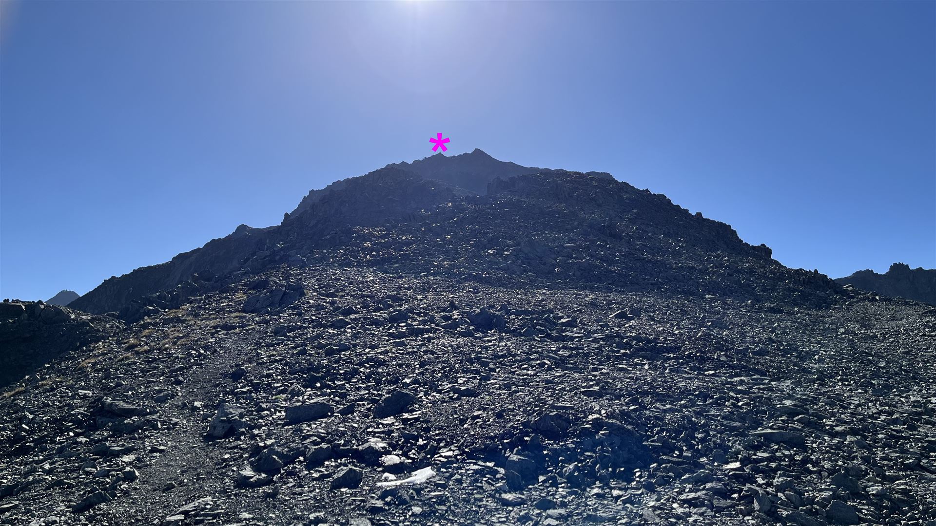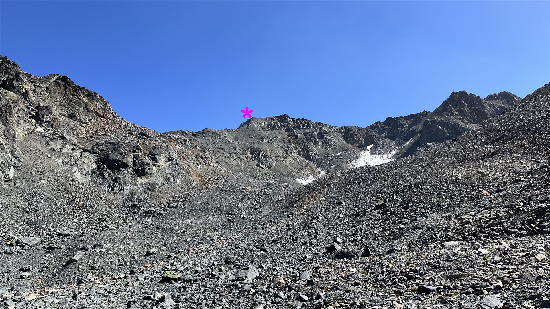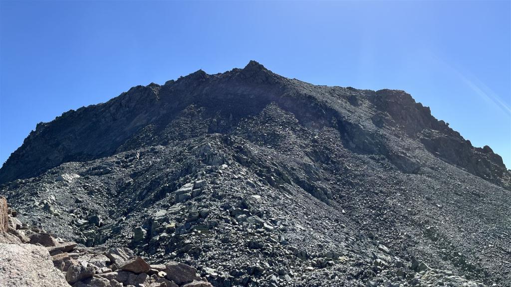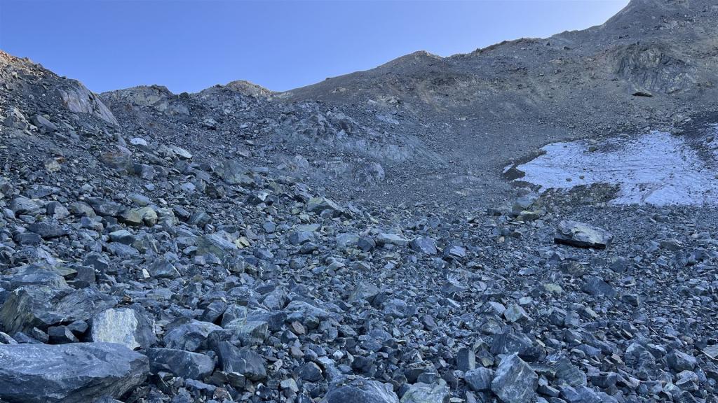 Vom Scalettapass auf das Scalettahorn geht aus dann weglos zuerst ein kleines Stück auf Gras, dann auf Geröll, Geröll und Geröll. Den kleinen Gletscher konnte ich nicht zum Aufstieg benützen, da er zu hart gefroren und für meine Schuhe zu rutschig war.