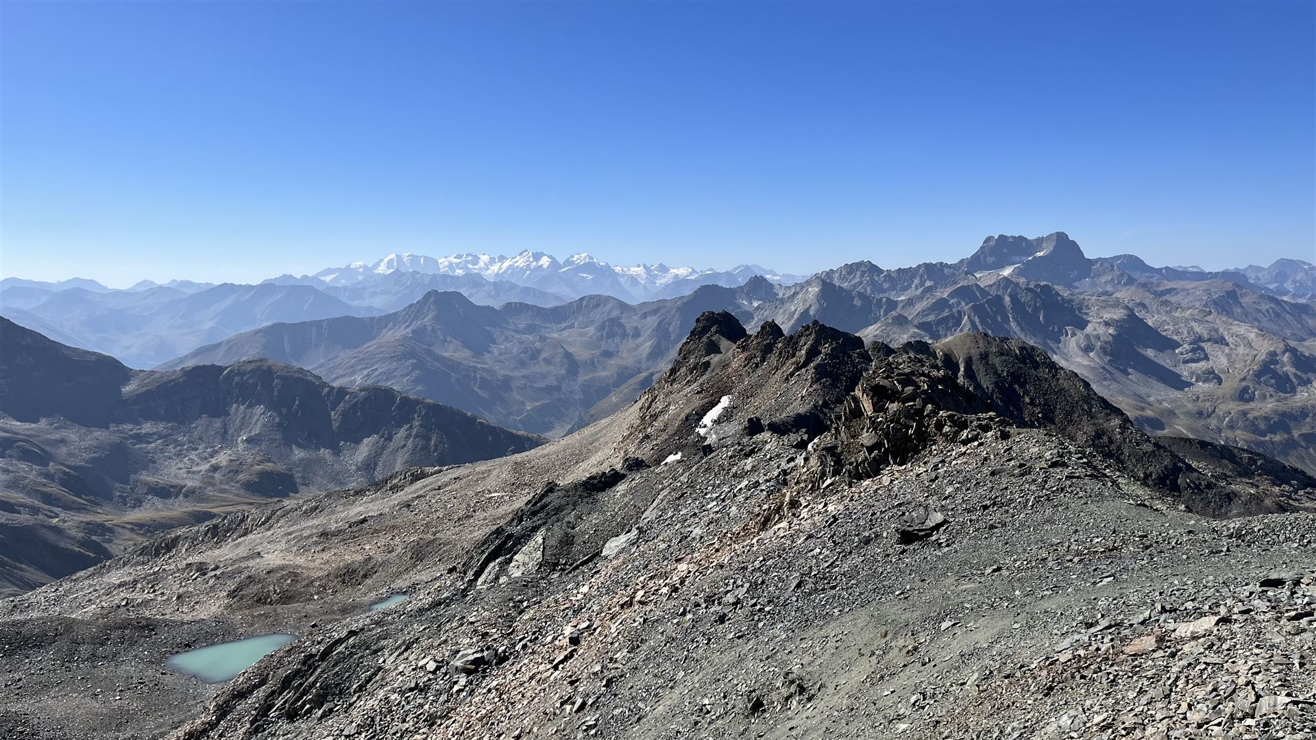 Auf dem Scalettahorn, Blick auf Piz Kesch, Tschimas da Tisch, Piz Calderas, Piz d'Err, Piz Forun, Piz Ela, Chüealphorn und andere
