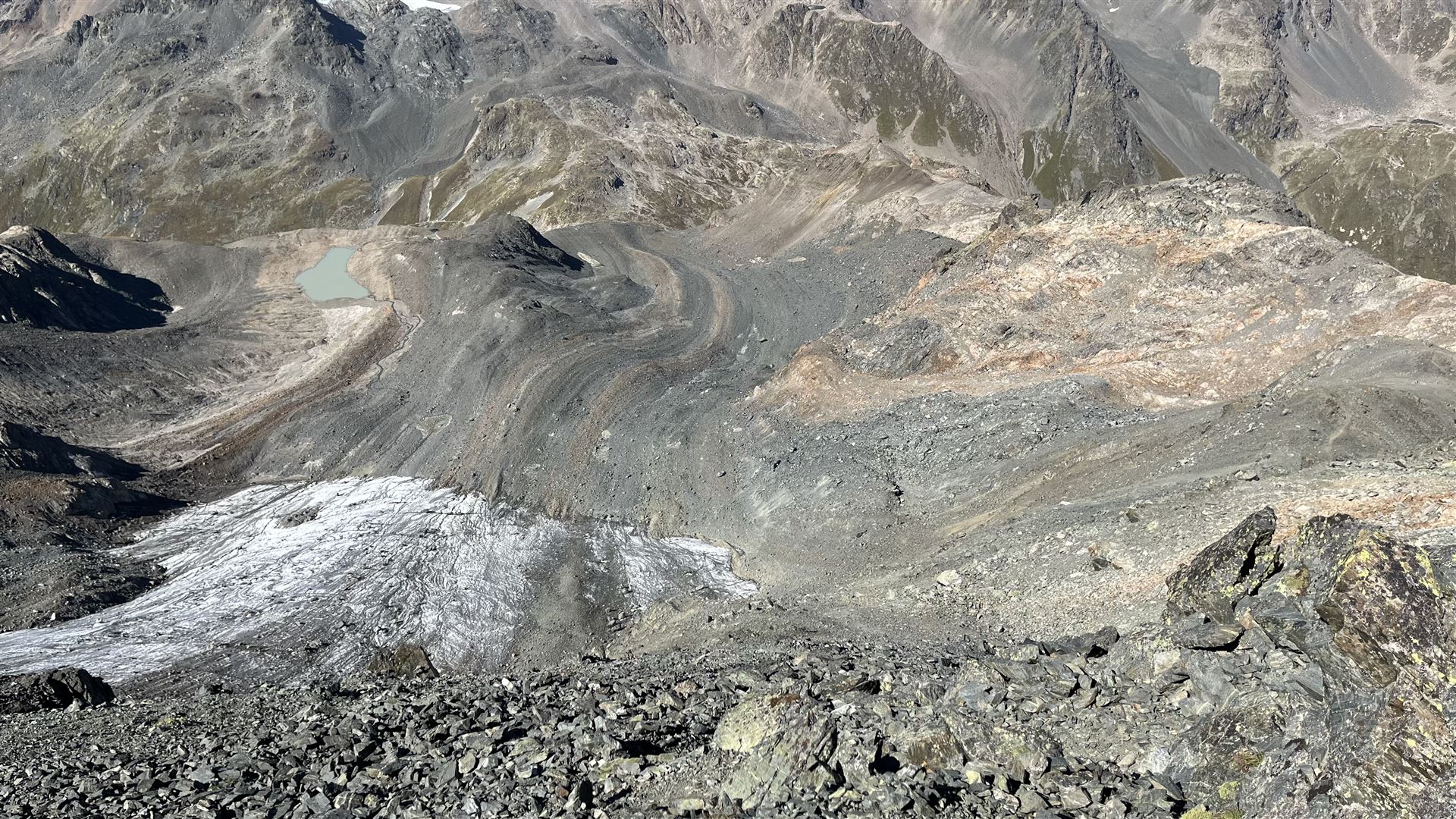 Auf dem Scalettahorn, Blick herunter zum Gletscher und meine Aufstiegsroute