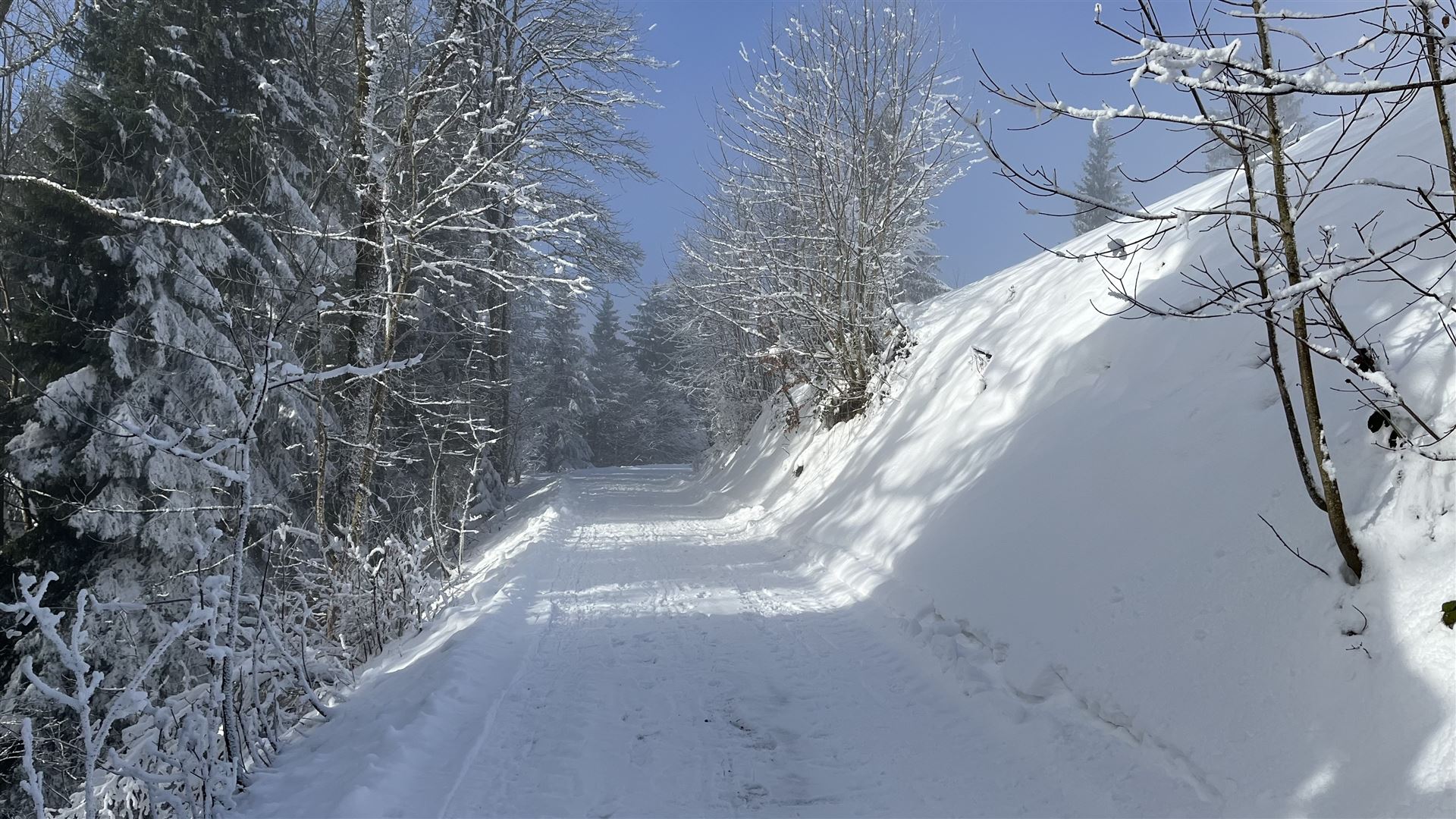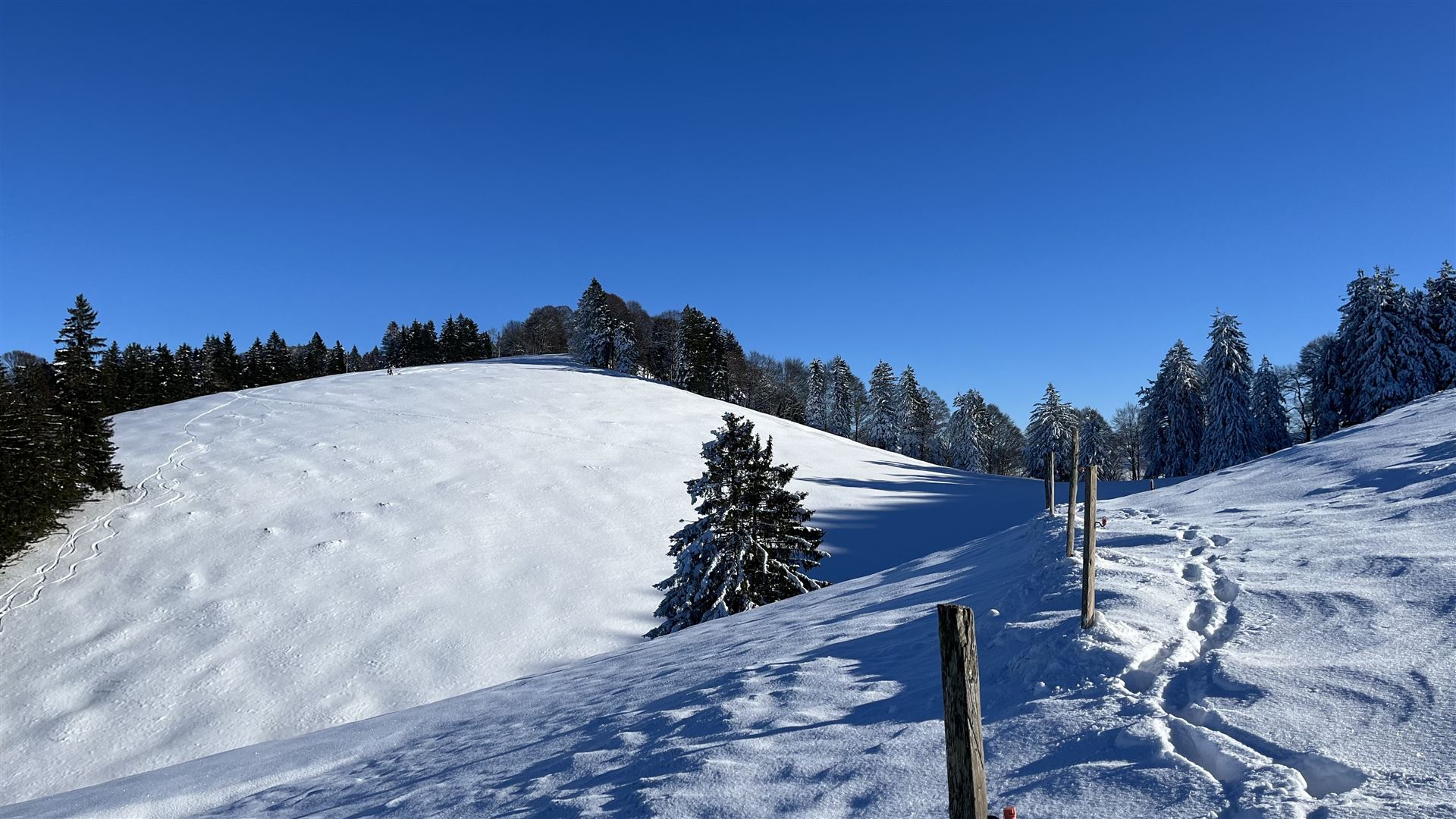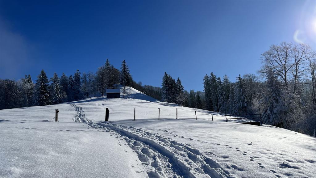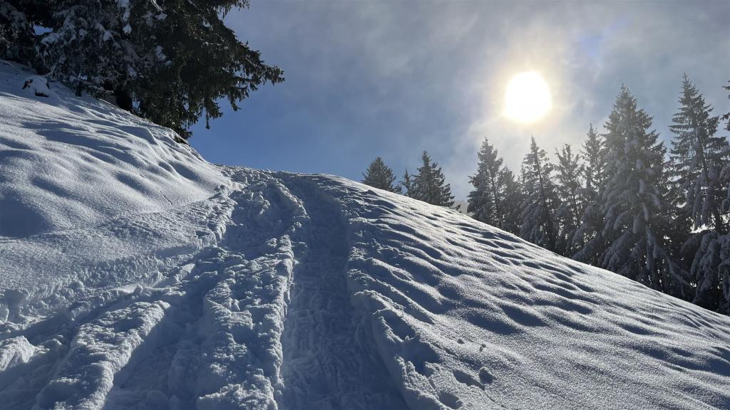 Genuss pur, mit den Winterschuhen im Schnee laufen. Dabei ein grösserer Teil im Tiefschnee teilweise mit Schneeschuh-Spuren.