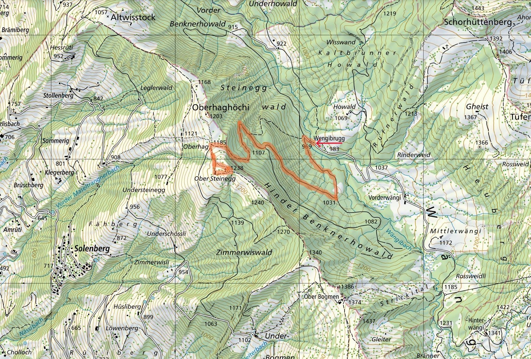 Diesmal als kurzen Weg direkt von der Wengibrugg durch den Wald hinauf auf die Ober Steinegg und mit dem gleichen Weg wieder zurück.