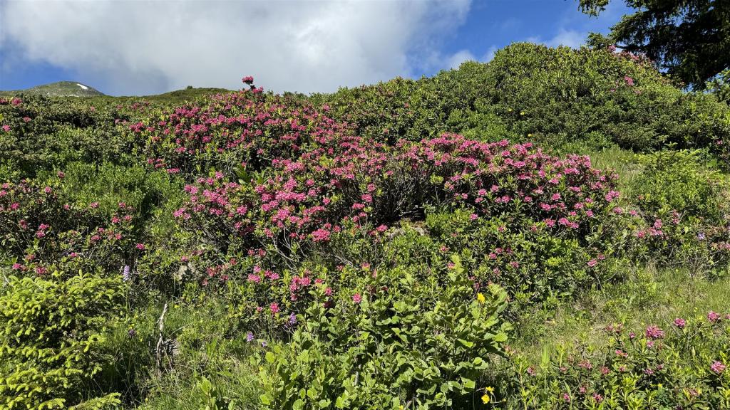 Der 2. Teil ab Conterser Duranna verlief dann weglos über Wiesenhänge mit blühenden Alpenrosen und allen möglichen anderen Blumen bis auf den Sattel bei 2212m.