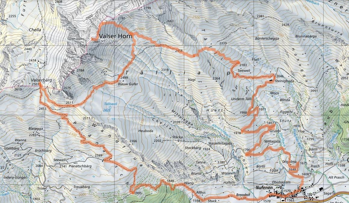 Nufenen GR (1570m) - Valserberg (2503m) - Valserhorn (2885m) - Steinigboda (2046m) - Nufenen GR (1570m)