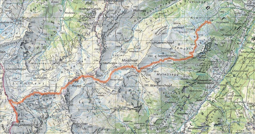 Mels Vermol Riet (1617m) - Madfurggl (2149m) - Langrain (2271m) - Lauifurggla (2192m) - Siezfurggla (2315m) - Oxni (2393m) - Fansfurggla (2274m) - Wissgandstöckli (2487m) - Fansfurggla (2274m) - Oxni (2393m) - Siezfurggla (2315m) - Lauifurggla (2192m) - Langrain (2271m) - Madfurggl (2149m) - Mels Vermol Riet (1617m)