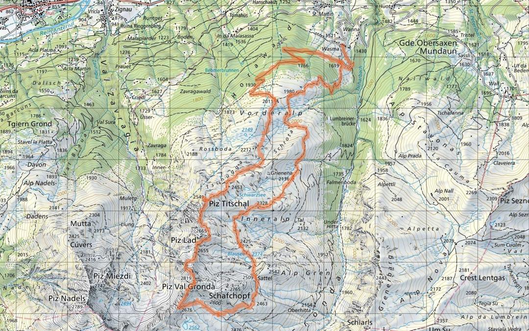Obersaxen St.Martin Wasma (1534m) - Vorderalp (2011m) - Piz Titschal (2549m) - Piz Val Gronda (2819m) - Sattel (2509m) - Blausee (2374m) - Grienena (2136m) - Obersaxen St. Martin Wasma (1534m)