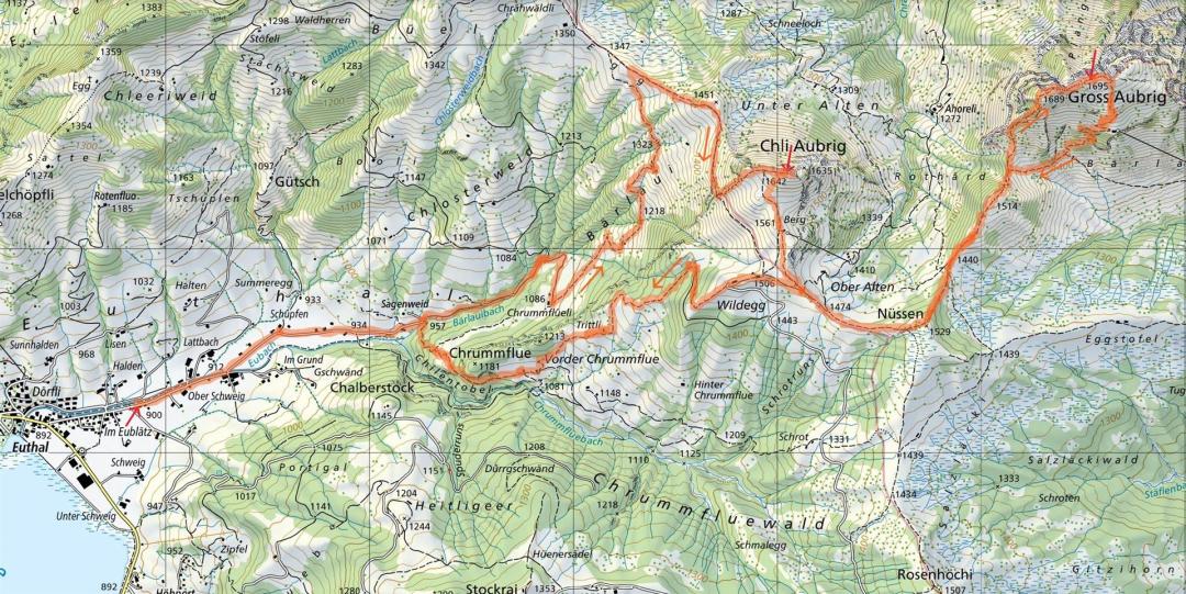 Überrascht wurde ich vom Auf und Ab zwischen Nüssen und dem Fuss (Beginn des Aufstiegs) zum Gross Aubrig. Es ging von 1529m zuerst runter auf 1440m, dann wieder hoch auf 1514m und dann wieder runter auf ca. 1460m. Auf dem Rückweg waren es 1410m. Und auf dem Rückweg war ich auf dieser Strecke sehr am Kämpfen.