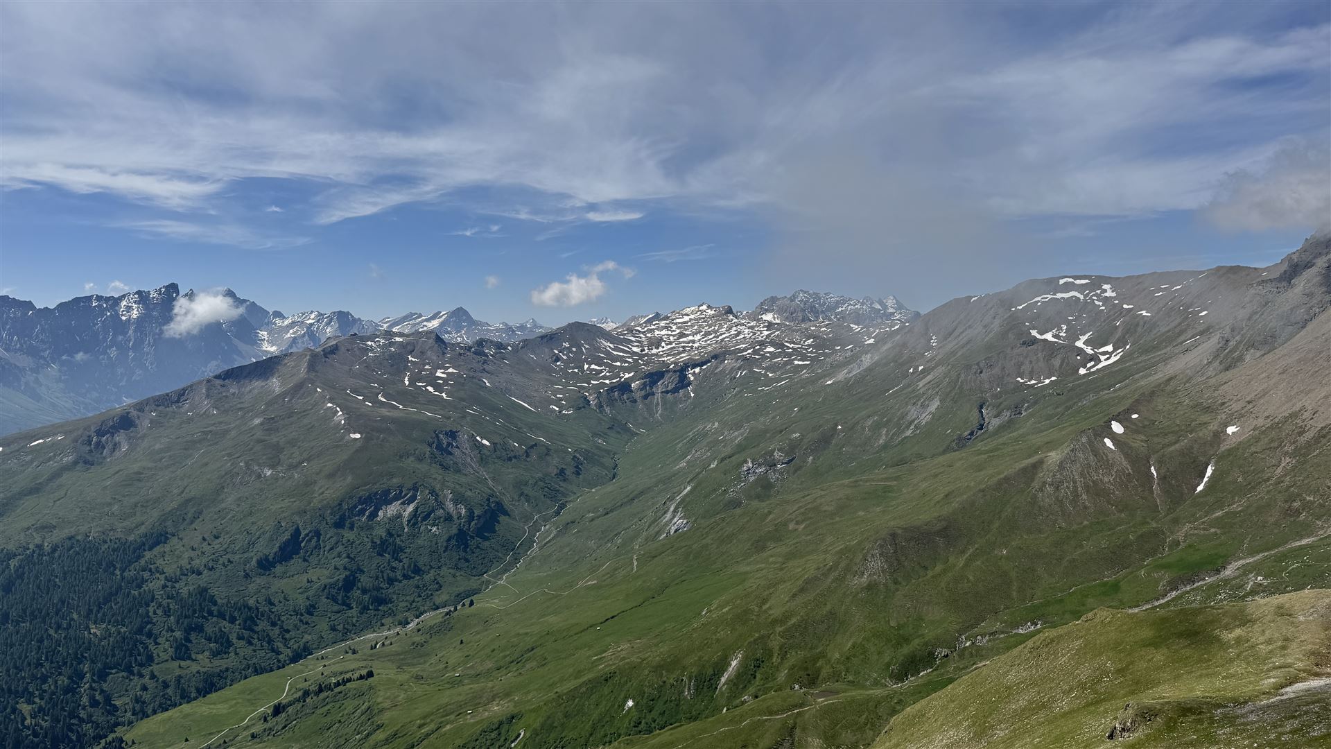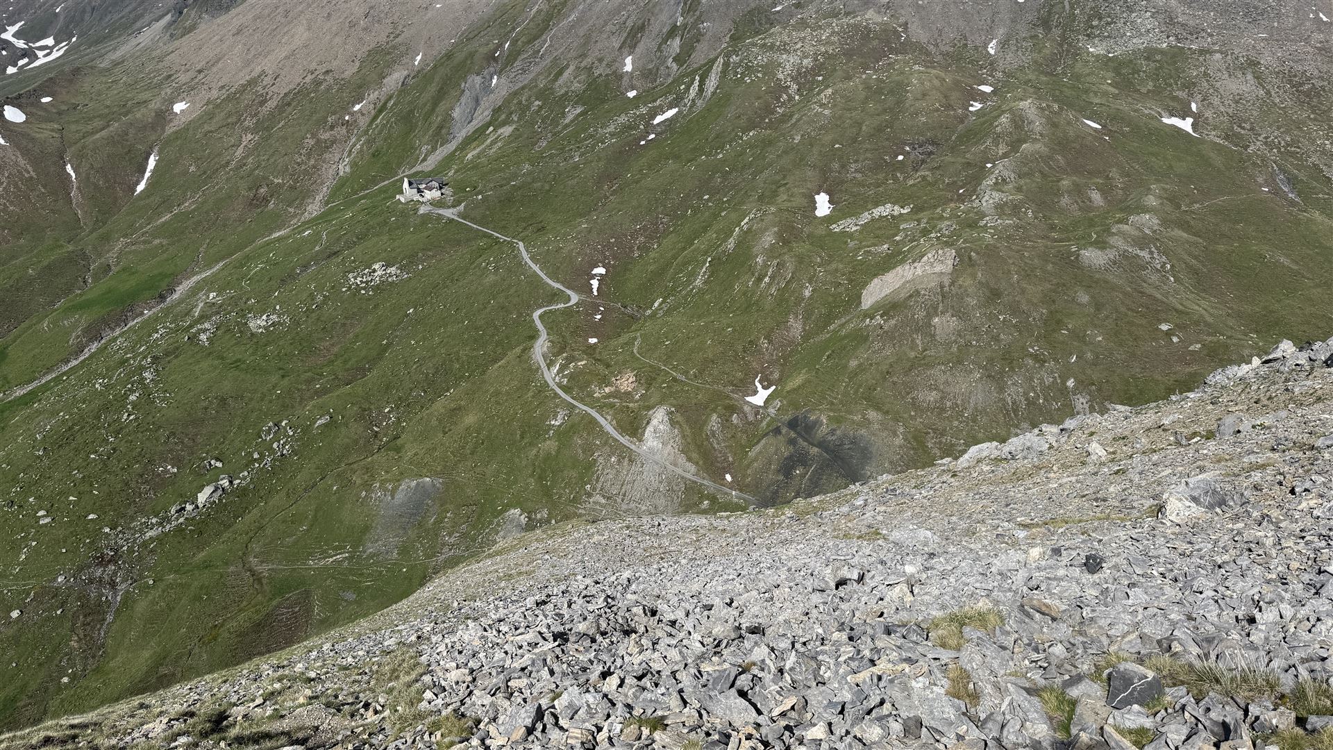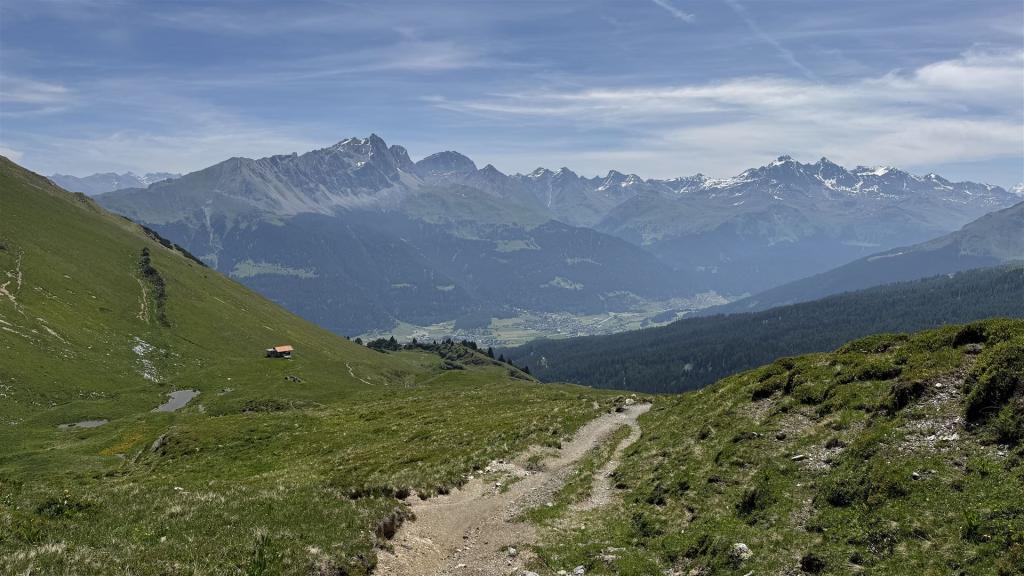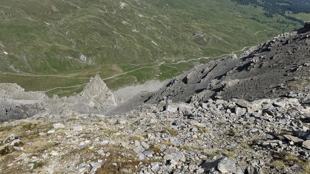 Auf dem Piz Toissa, Blick hinunter auf den Weg von Munter zur Furcletta
