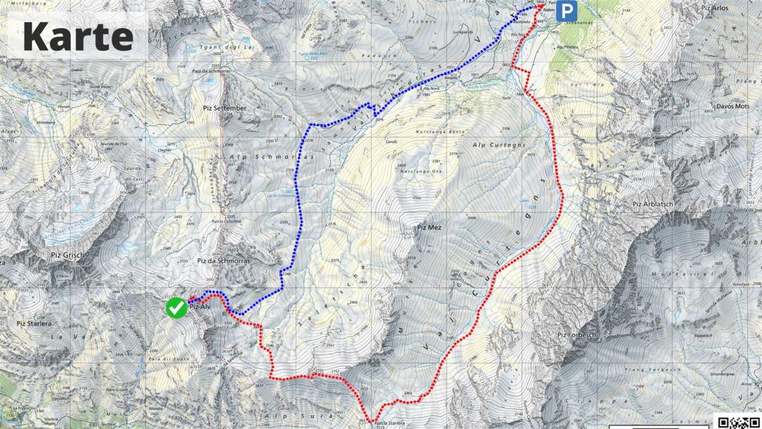 Eigentlich war die Tour mit Aufstieg im Val Schmorras und mit Abstieg im Val Curtegns vorgesehen. Erst kurz vor der Tour habe ich den Aufstieg im Val Curtegns und den Abstieg im Val Schmorras gewechselt.