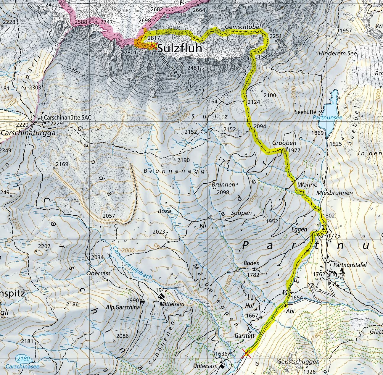 St. Antönien-Untersäss Parkplatz P6 (1620m) - Pt. 2124 - Gemschtobel - Sulzfluh (2817m) - Gemschtobel - Pt. 2124 - St. Antönien-Untersäss Parkplatz P6 (1620m)